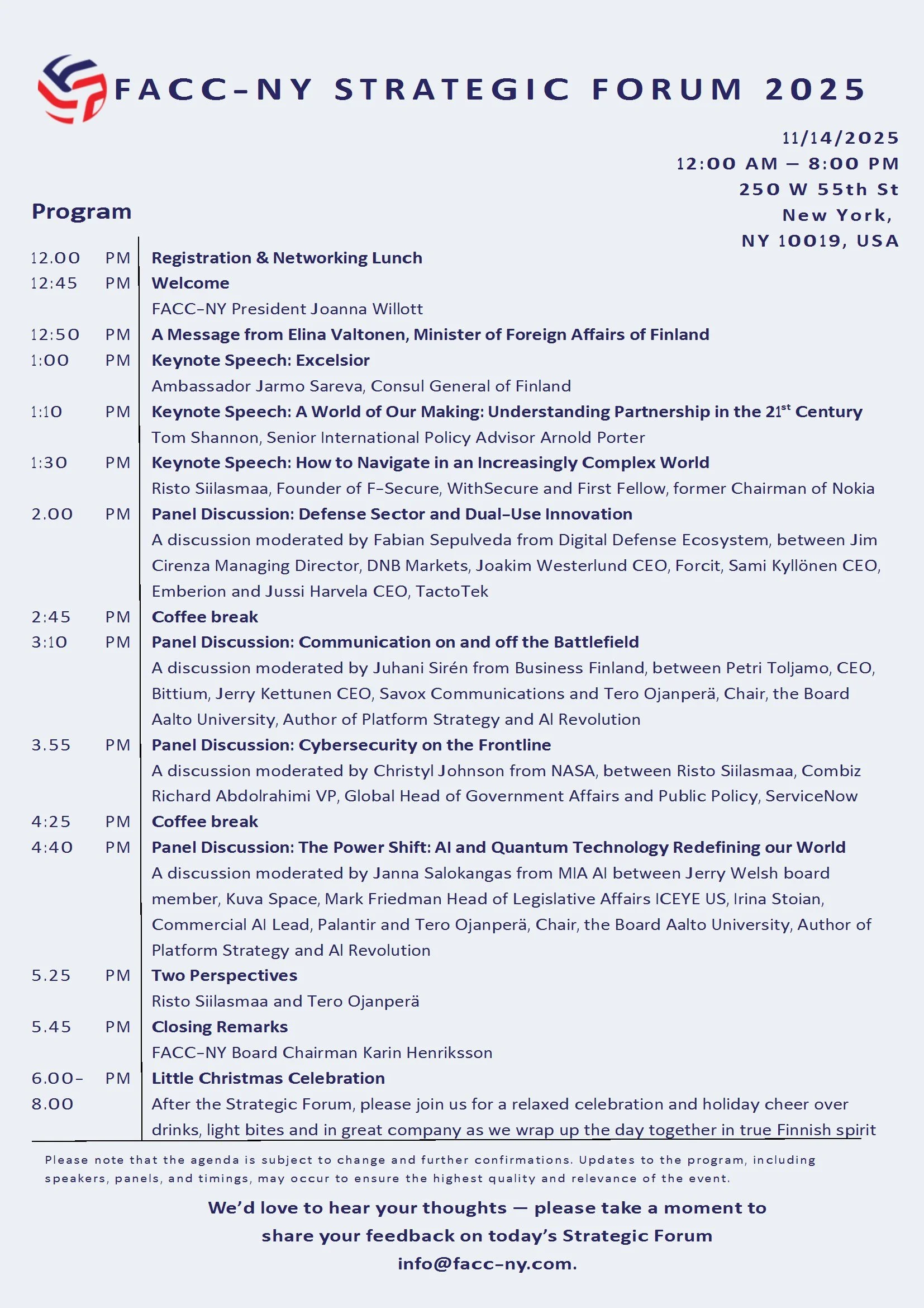 On November 14, 2025, the Finnish American Chamber of Commerce in New York hosted its Strategic Forum 2025. The Forum brought together business and thought leaders from Finland and the U.S. to discuss topics of dual-use technologies, quantum, AI and security – which the event title indicated – How Finnish Defence, Cyber & AI Innovation Strengthen U.S. – Finnish Trade and Resilience.