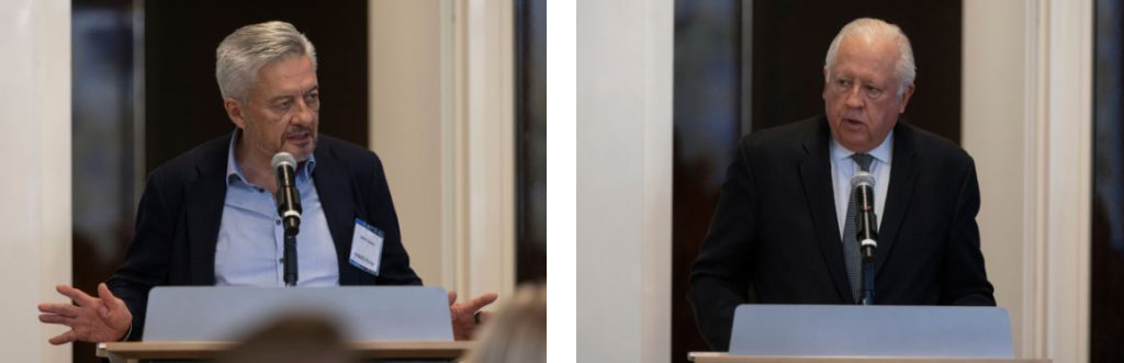 Ambassadors Jarmo Sareva and Tom Shannon during their respective keynote speeches at the FACC-NY Strategic Forum 2025